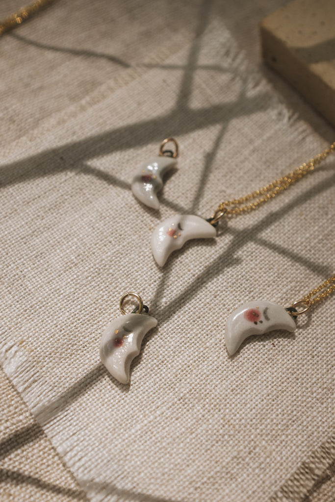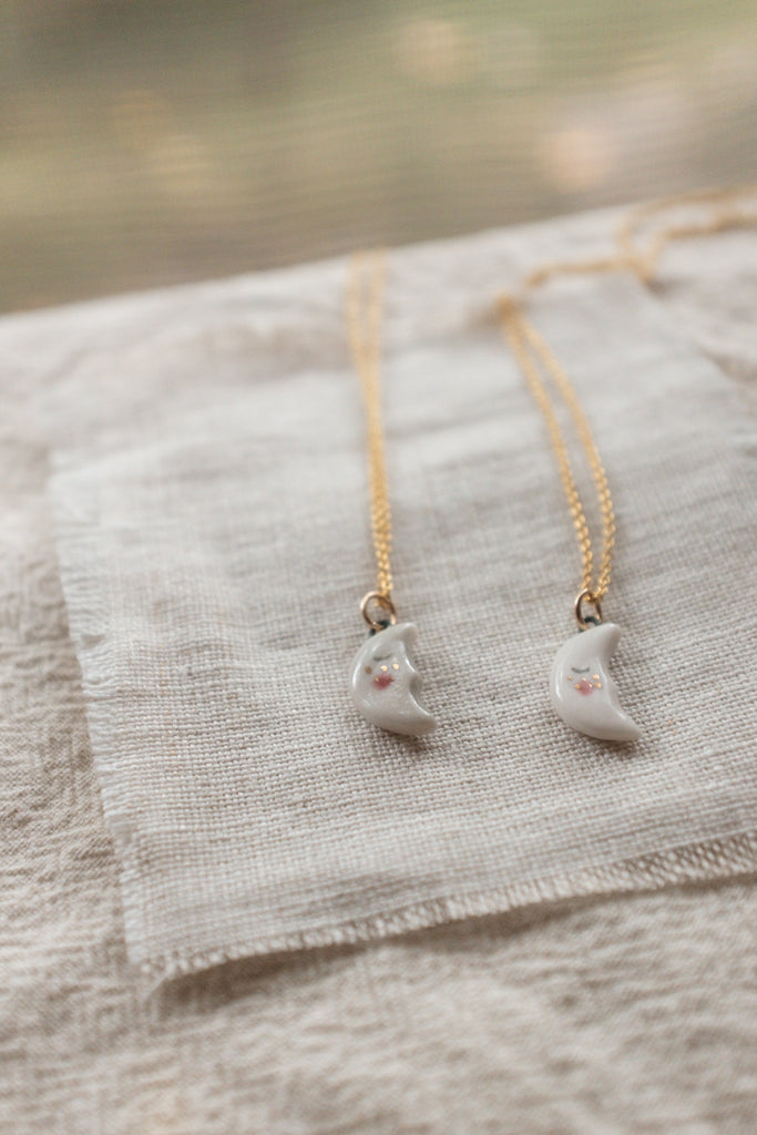 Each little hand-carved moon sports some adorable 22k gold freckles. Straight from the pages of your favorite fairy tale.